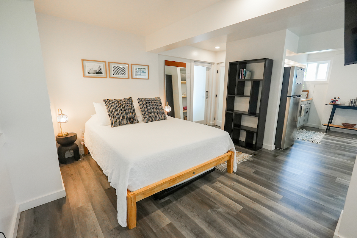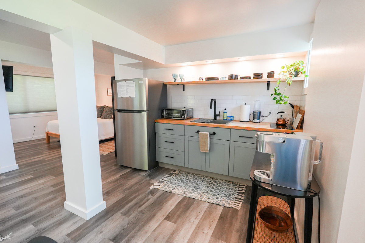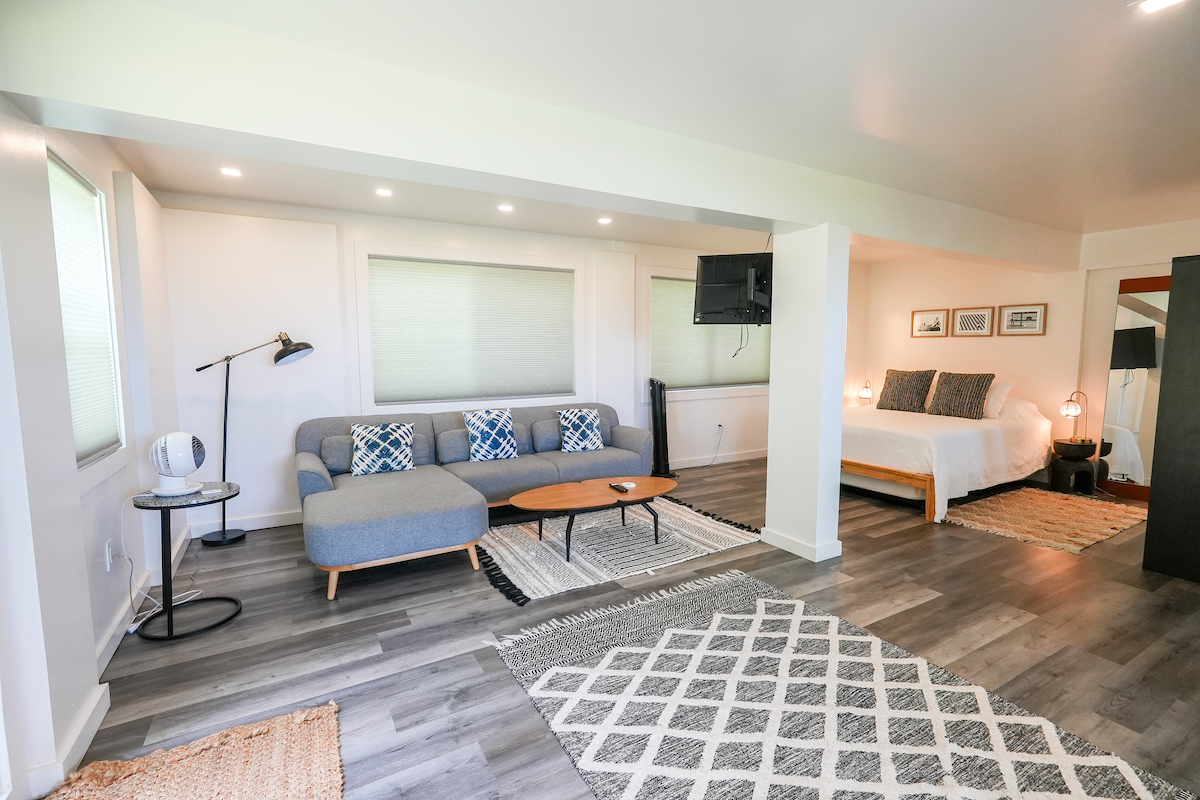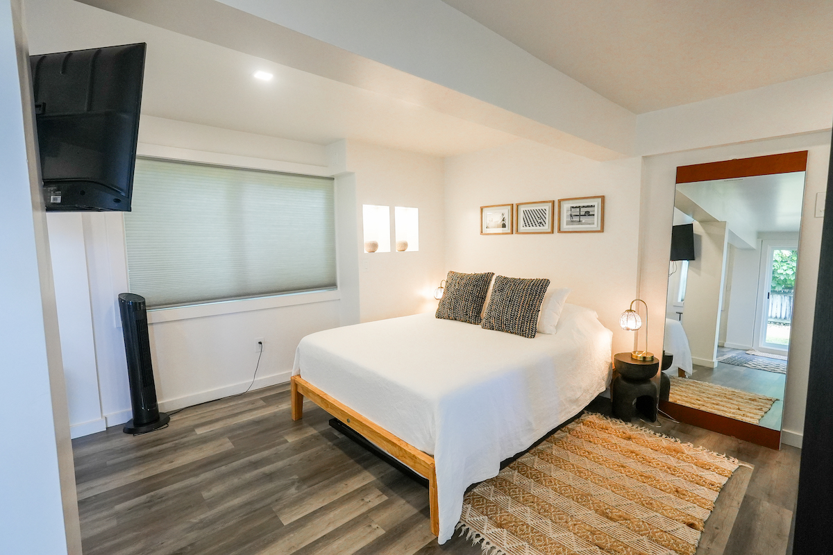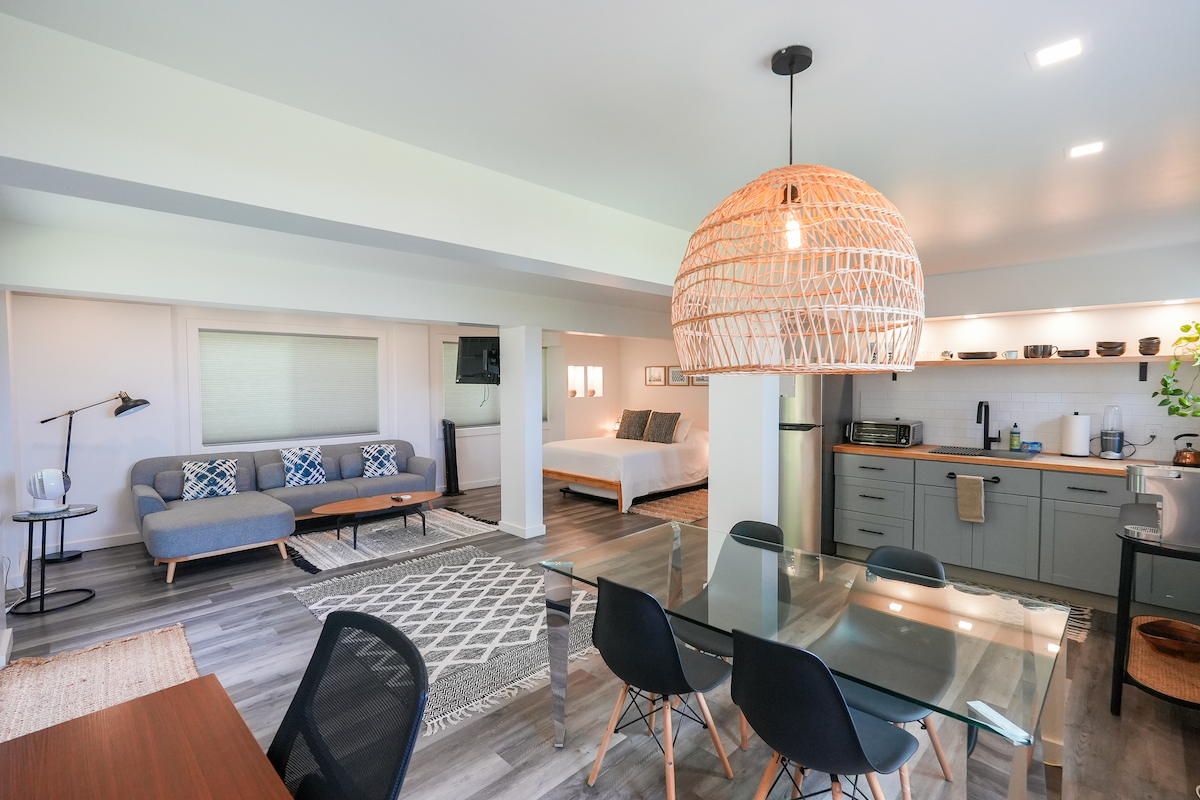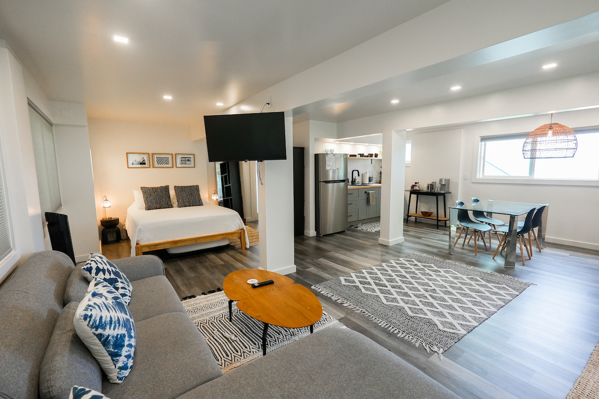 Private Studio: The downstairs studio is a hidden gem, everything brand-new. With its own living room, wet bar, dining table, work desk and chair, full bathroom, it’s an ideal space for guests seeking solitude. A queen bed and a pull-out twin bed ensure a good night’s rest. Studio is for adults ONLY.