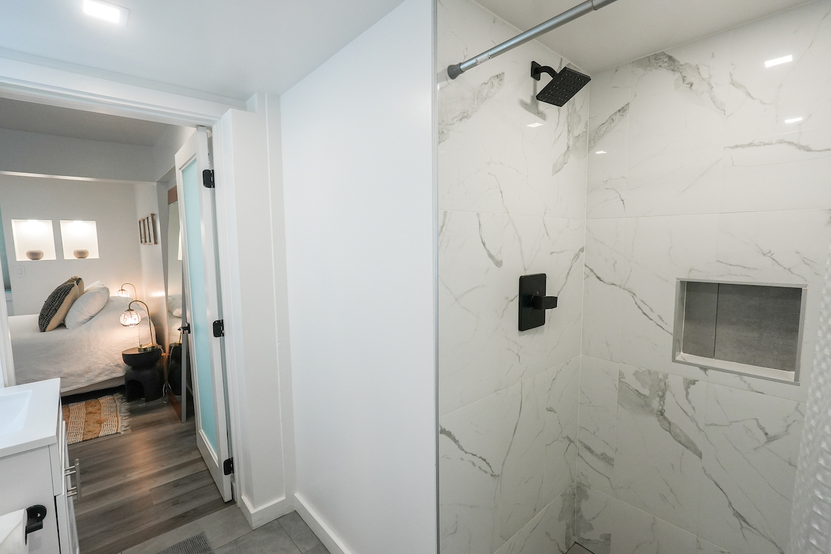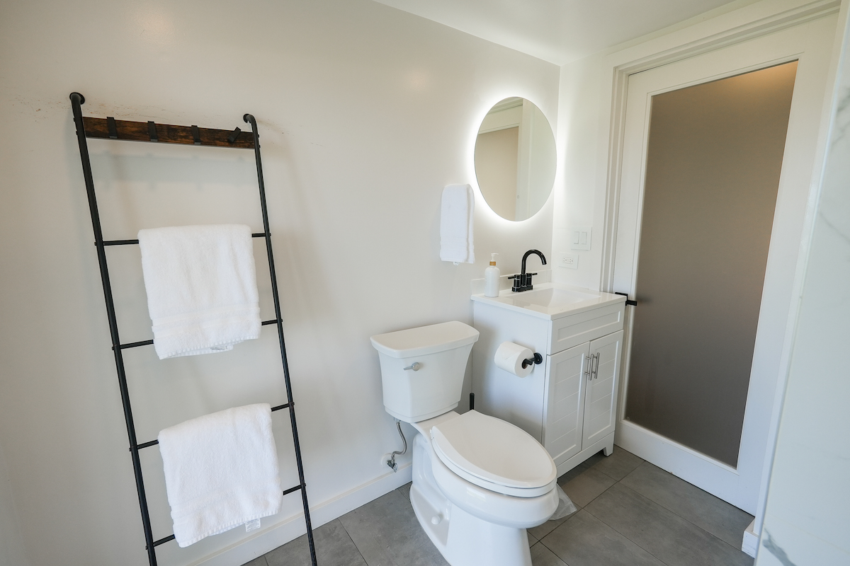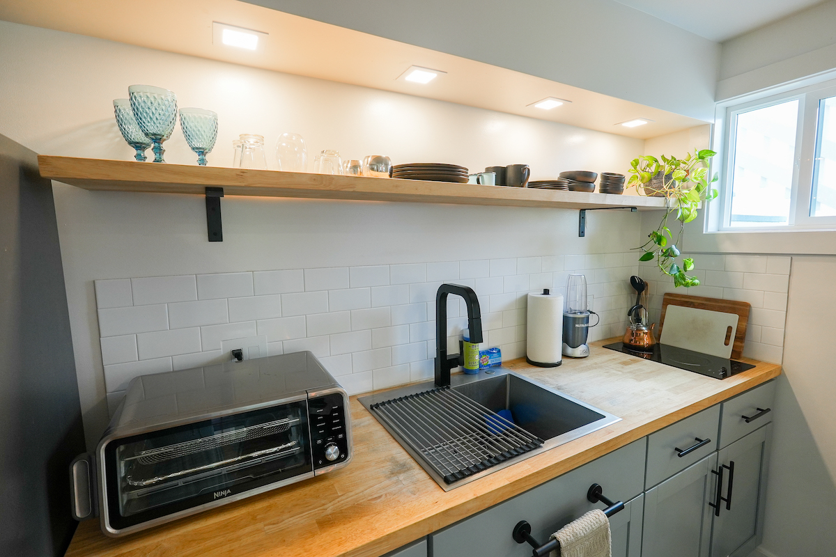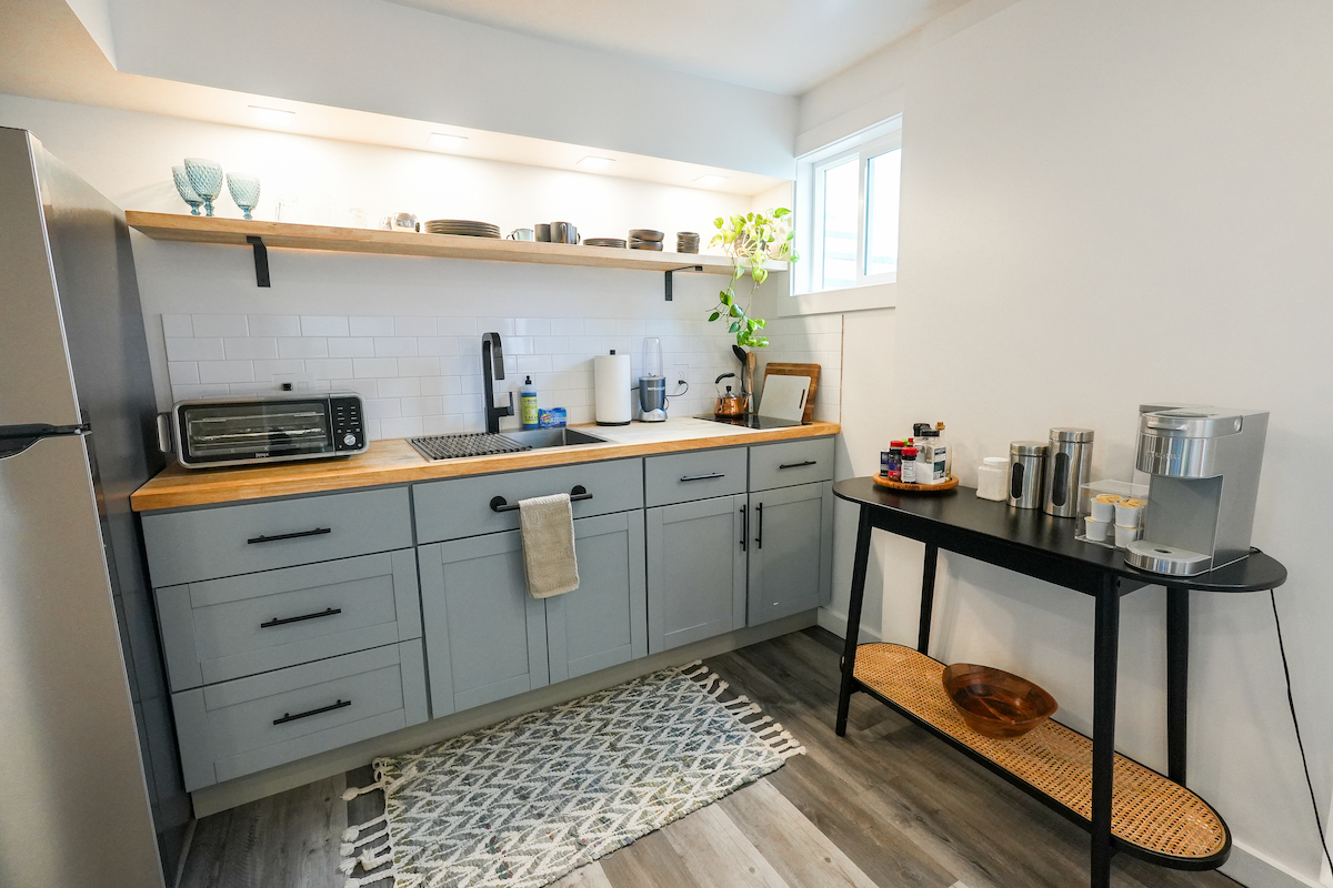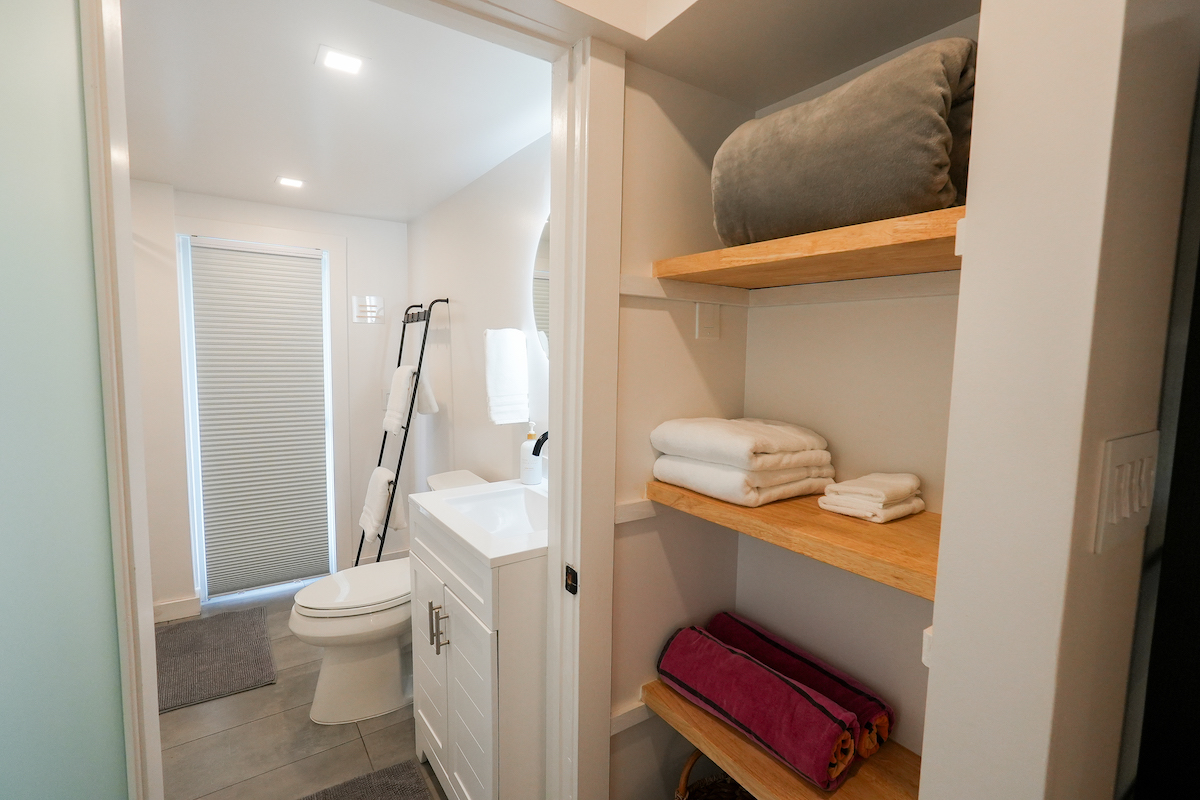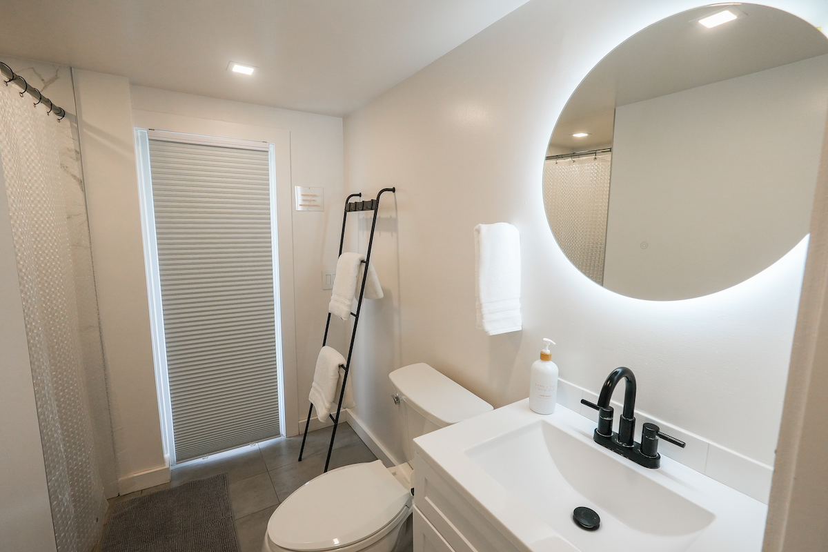 Private Studio: The downstairs studio is a hidden gem, everything brand-new. With its own living room, wet bar, dining table, work desk and chair, full bathroom, it’s an ideal space for guests seeking solitude. A queen bed and a pull-out twin bed ensure a good night’s rest. Studio is for adults ONLY.