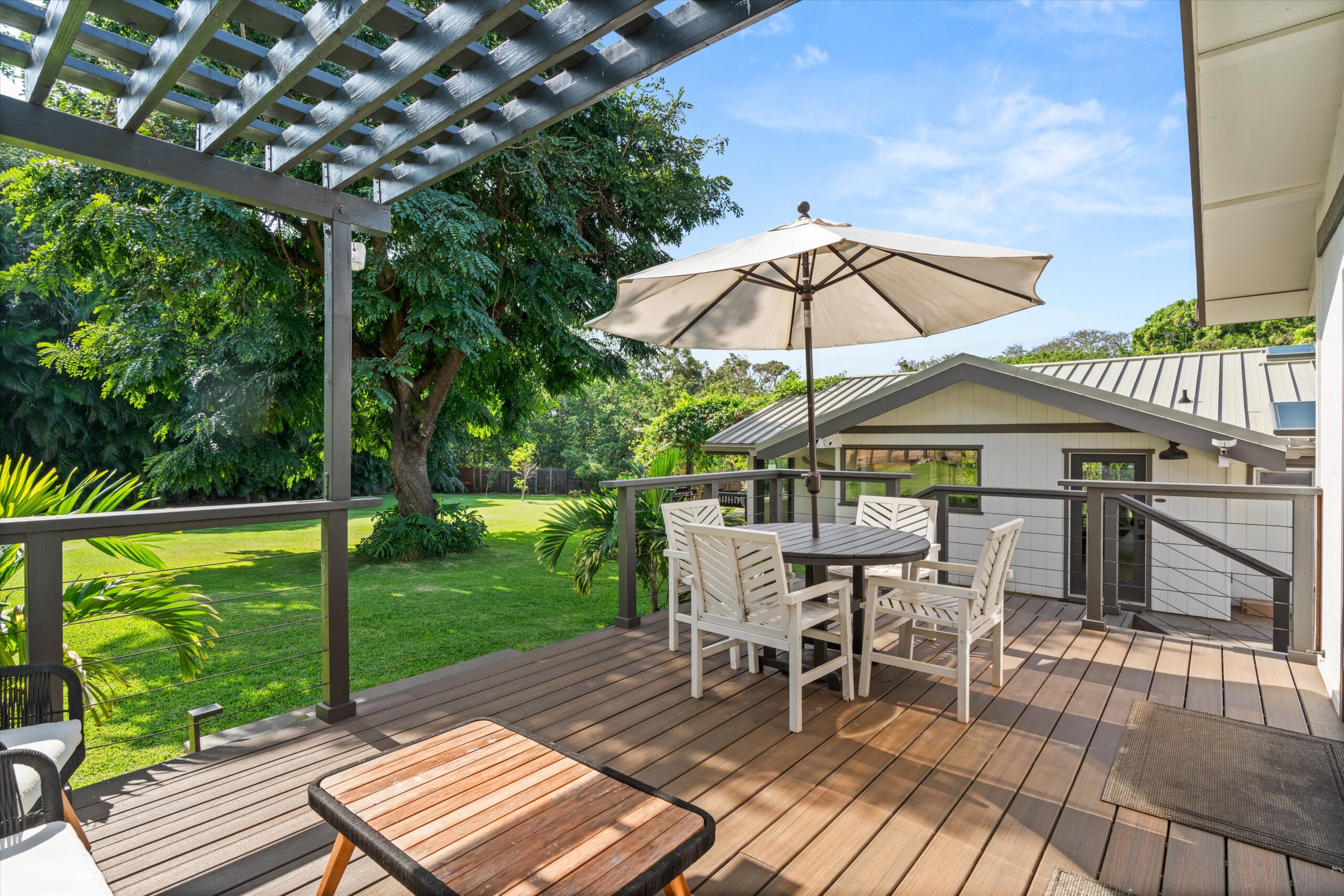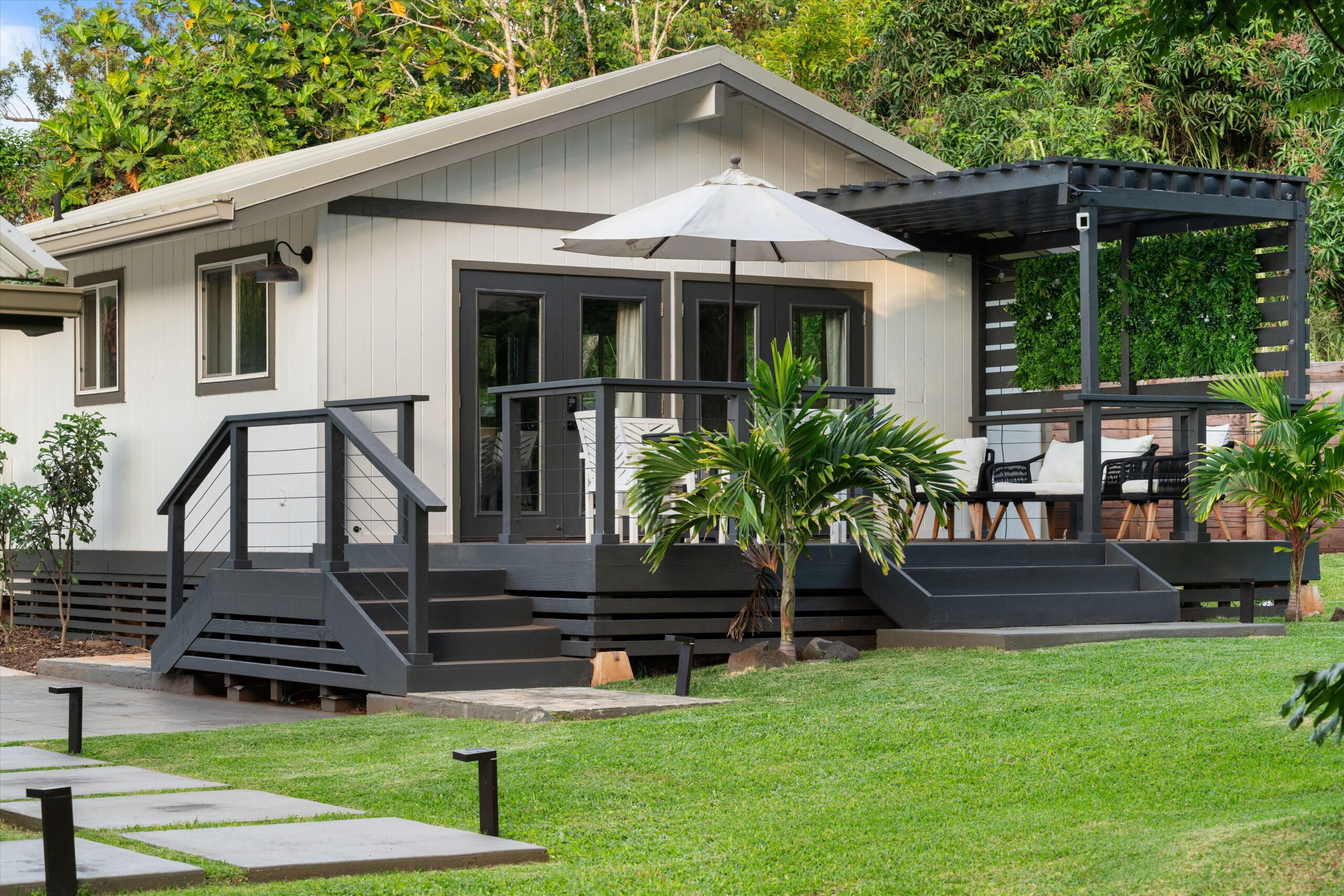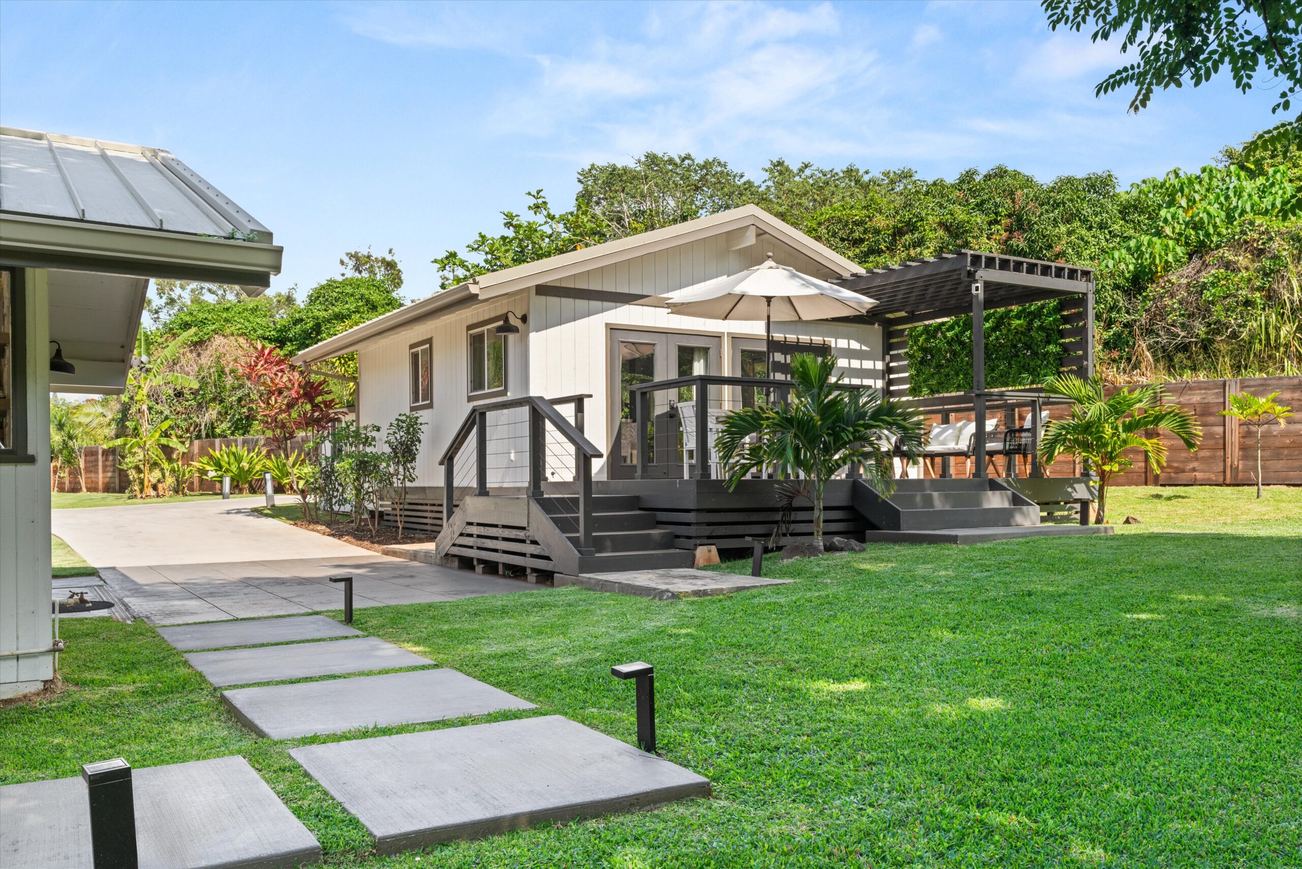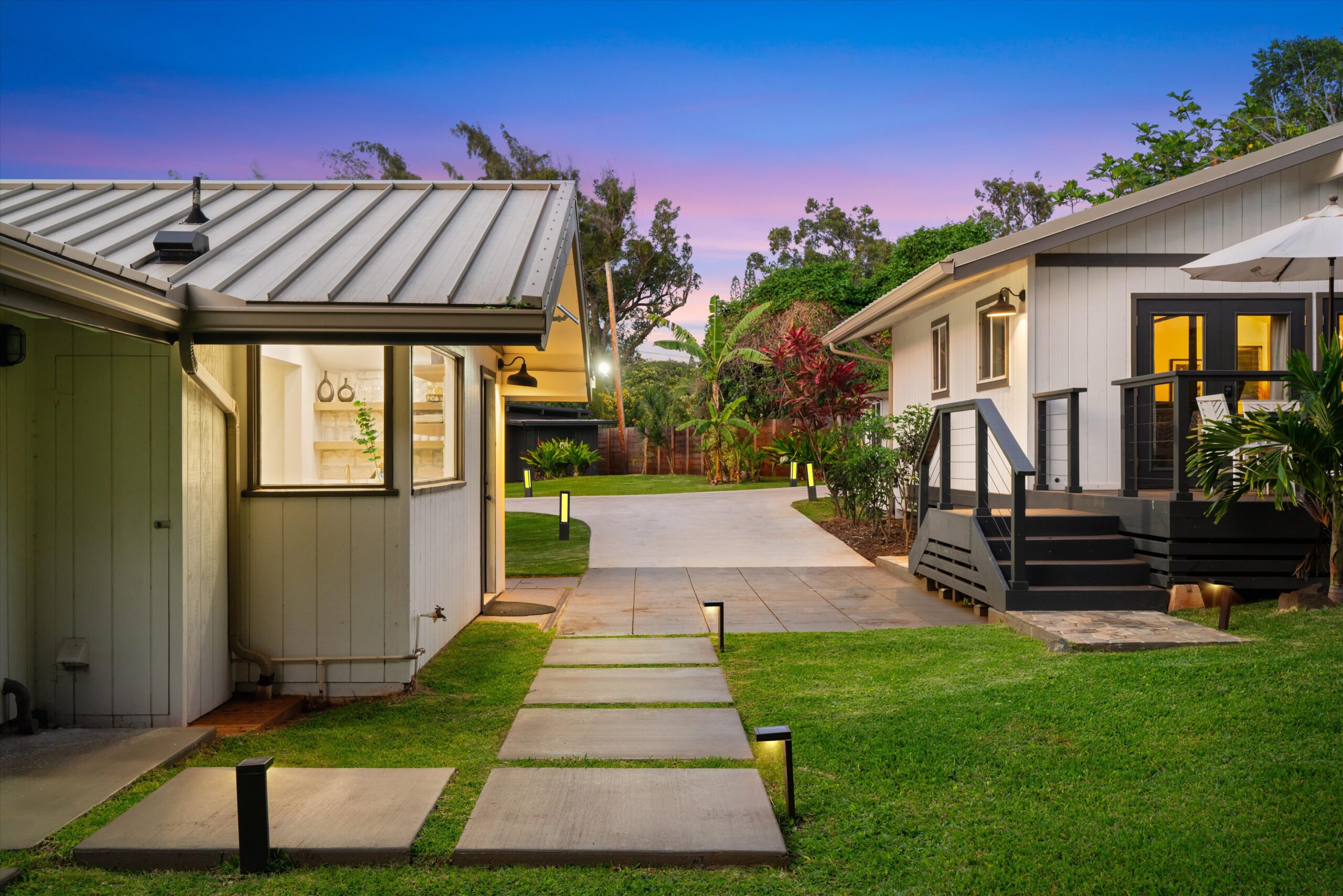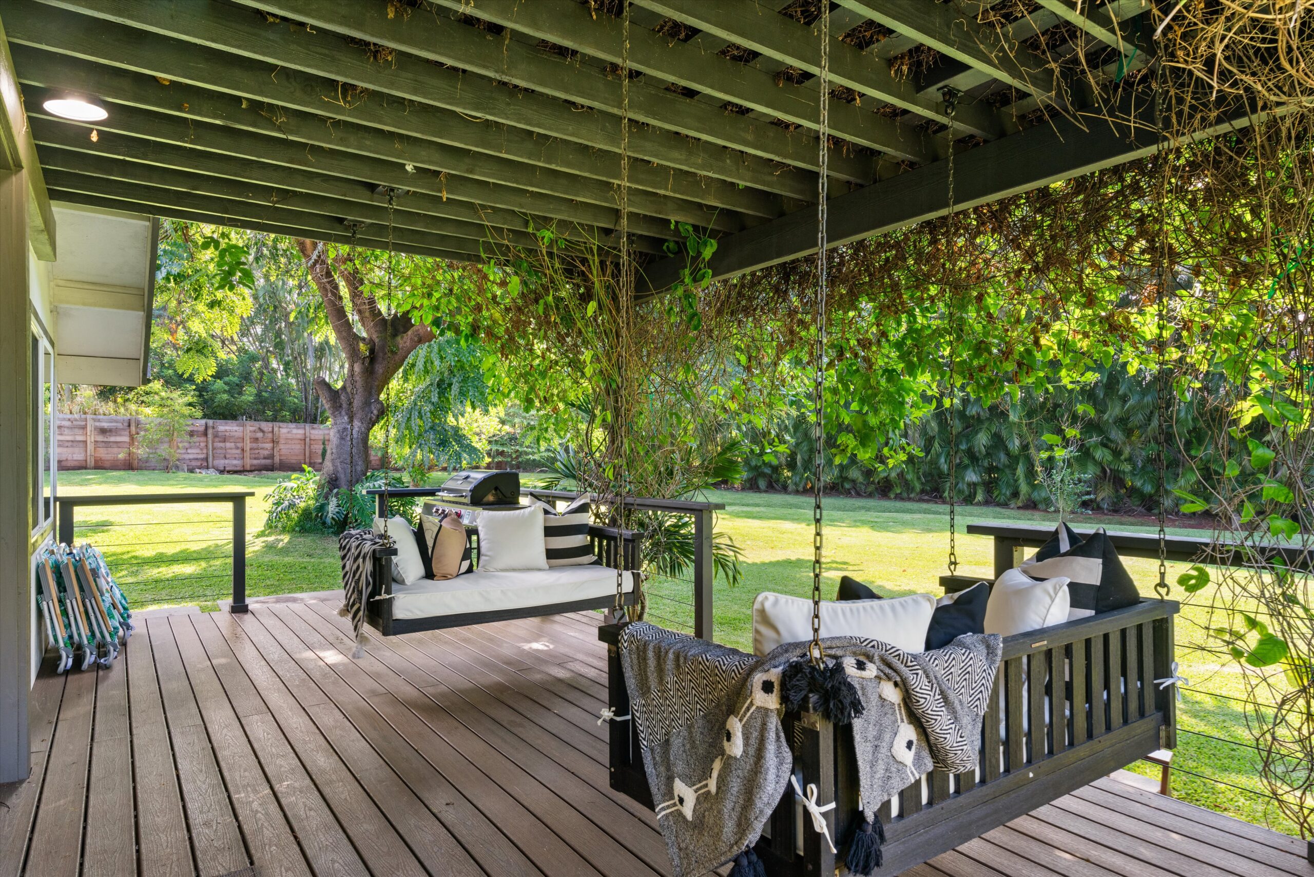 The detached guest house provides a peaceful escape with its own kitchen and private deck—perfect for quiet morning coffees or unwinding after a day at the beach. The lushly landscaped grounds feature a backyard oasis, where you can relax on the lanai, complete with charming bench swings and ample seating to enjoy Hawaii’s warm breezes.