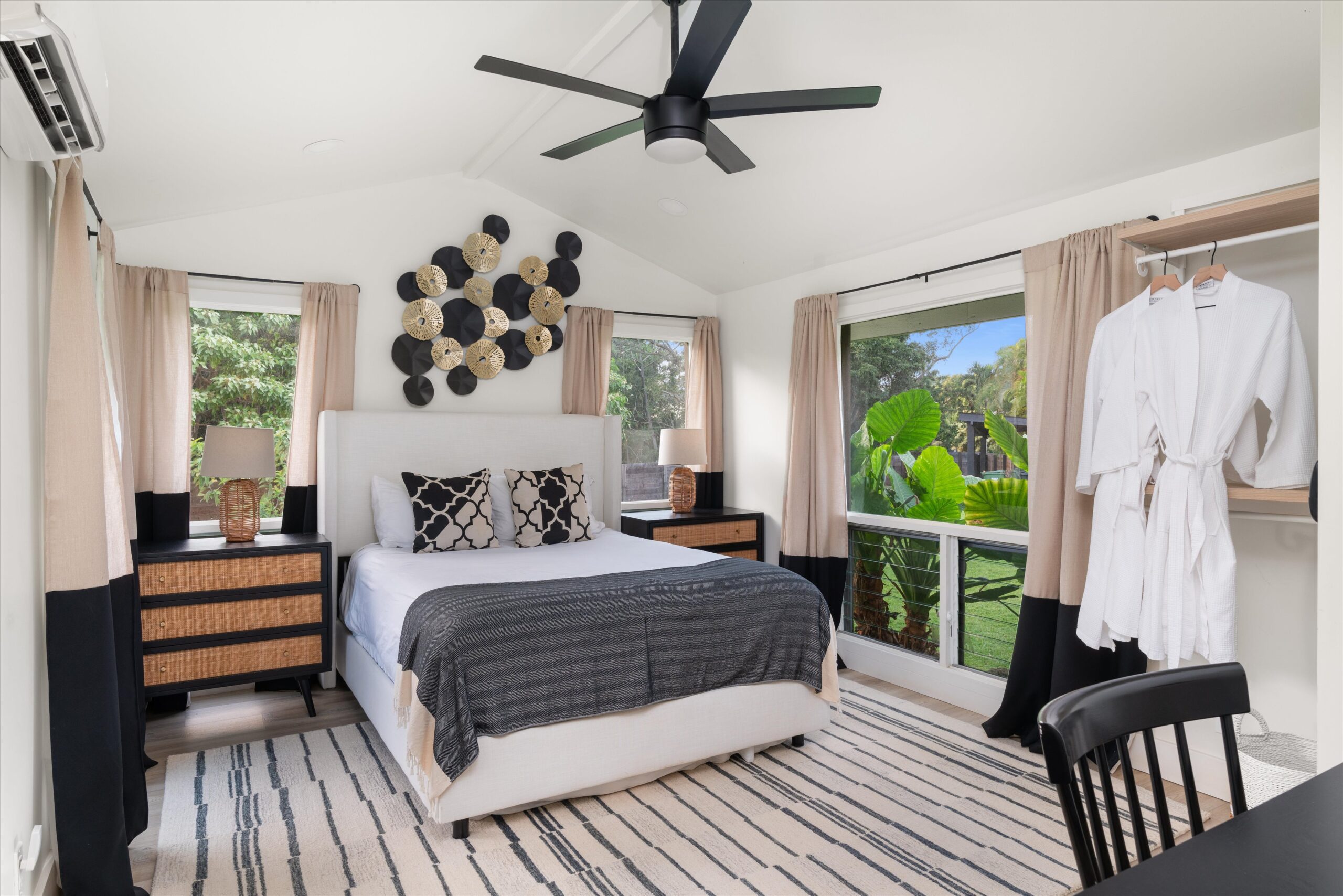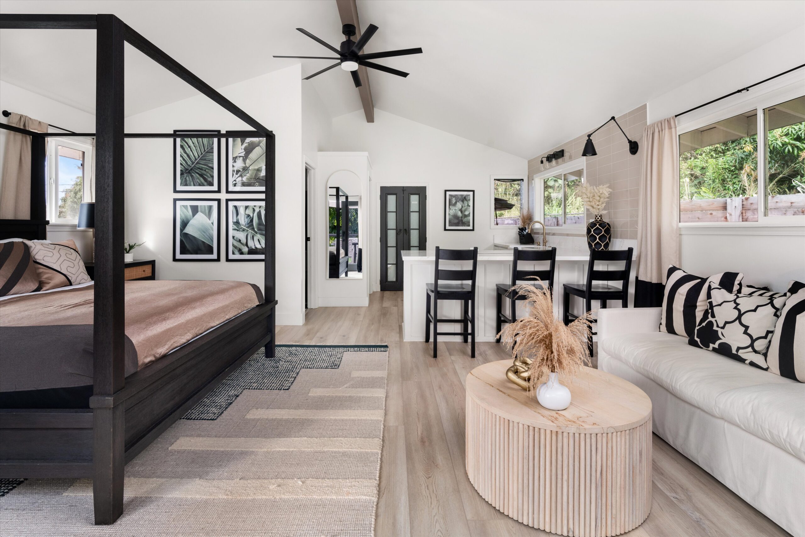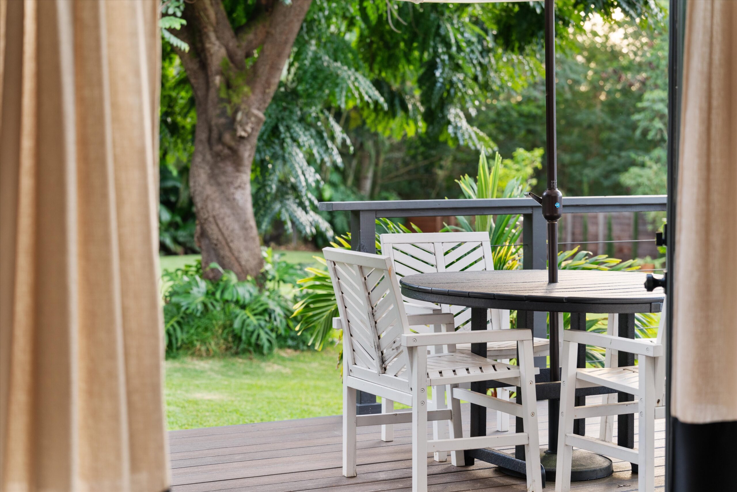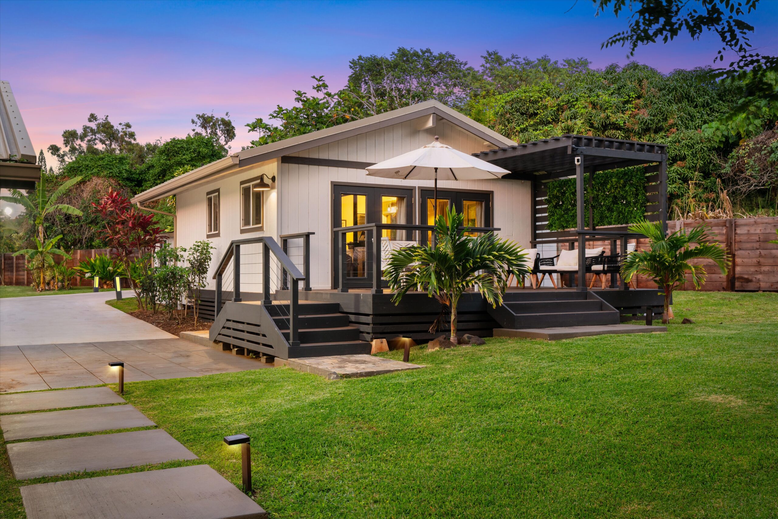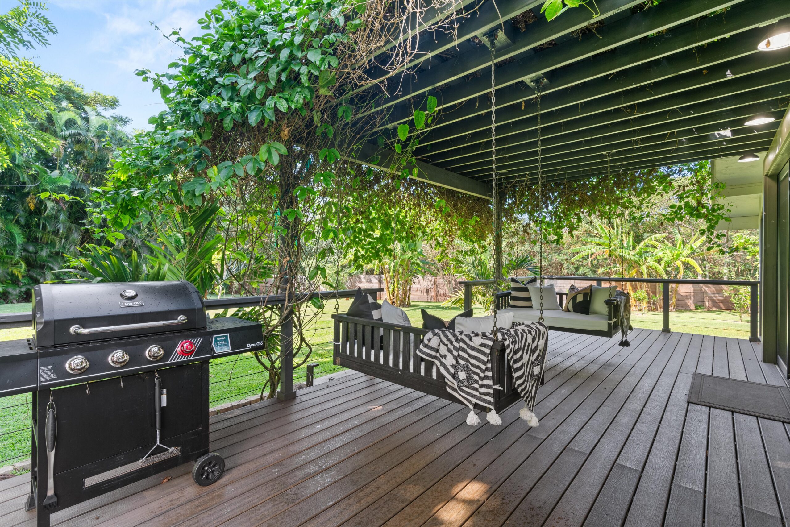 The detached guest house provides a peaceful escape with its own kitchen and private deck—perfect for quiet morning coffees or unwinding after a day at the beach. The lushly landscaped grounds feature a backyard oasis, where you can relax on the lanai, complete with charming bench swings and ample seating to enjoy Hawaii’s warm breezes.