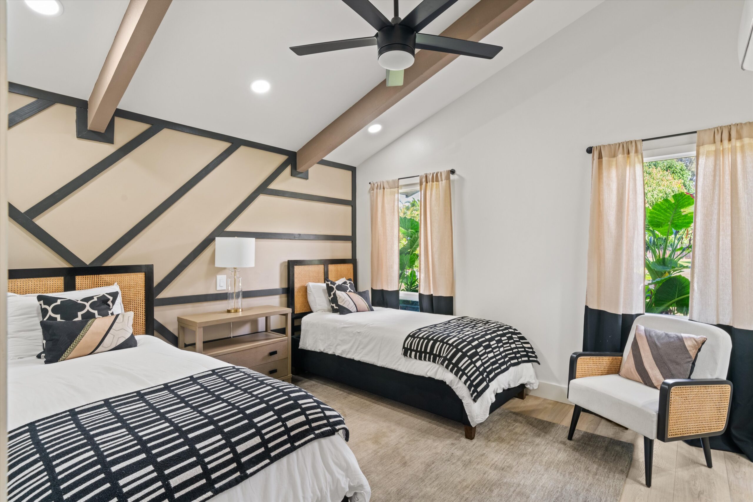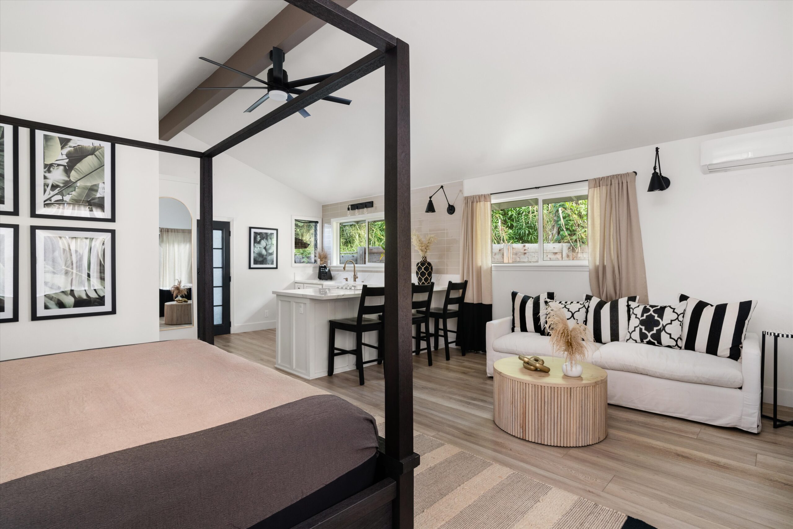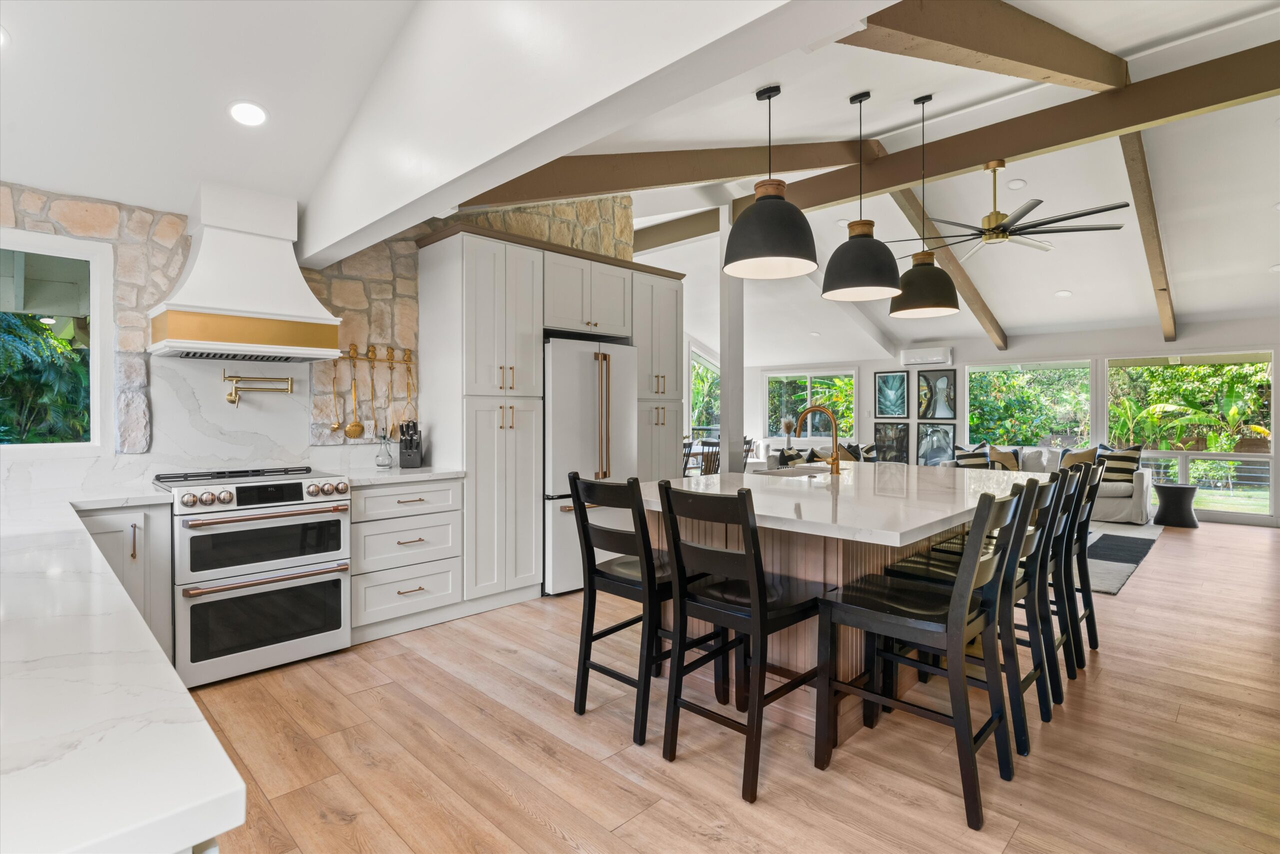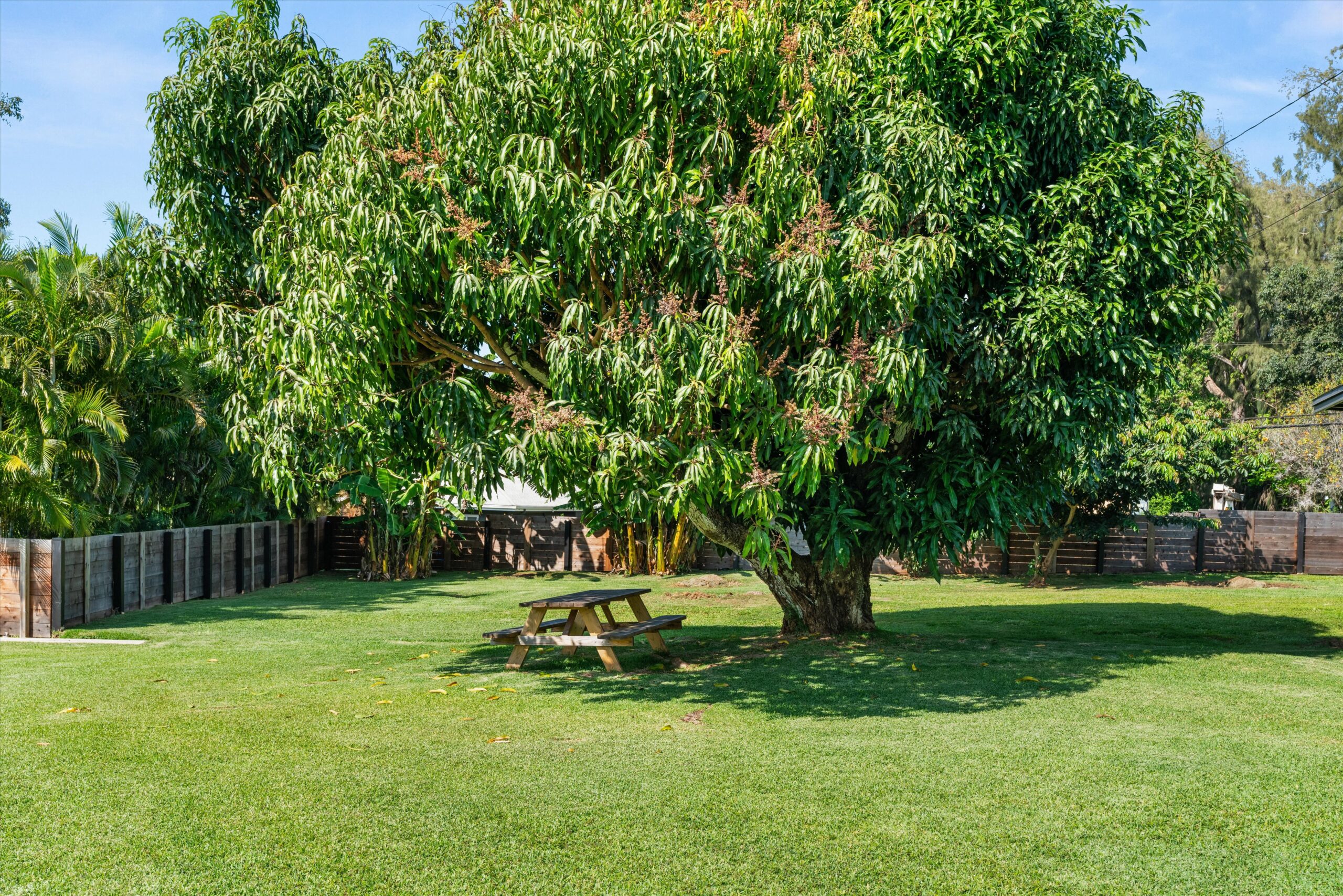 The detached guest house provides a peaceful escape with its own kitchen and private deck—perfect for quiet morning coffees or unwinding after a day at the beach. The lushly landscaped grounds feature a backyard oasis, where you can relax on the lanai, complete with charming bench swings and ample seating to enjoy Hawaii’s warm breezes.