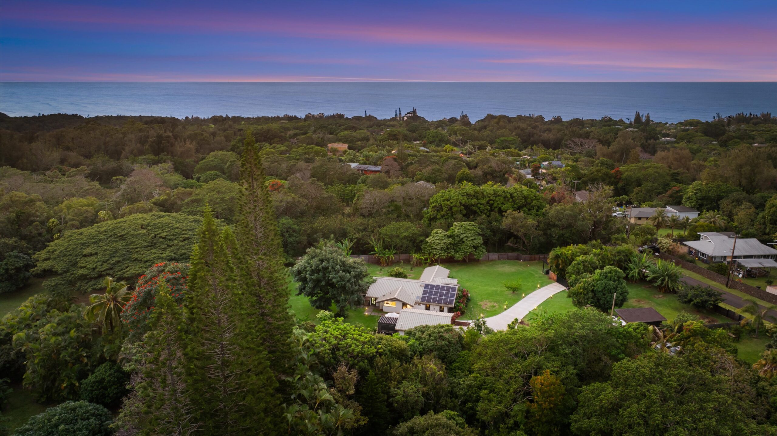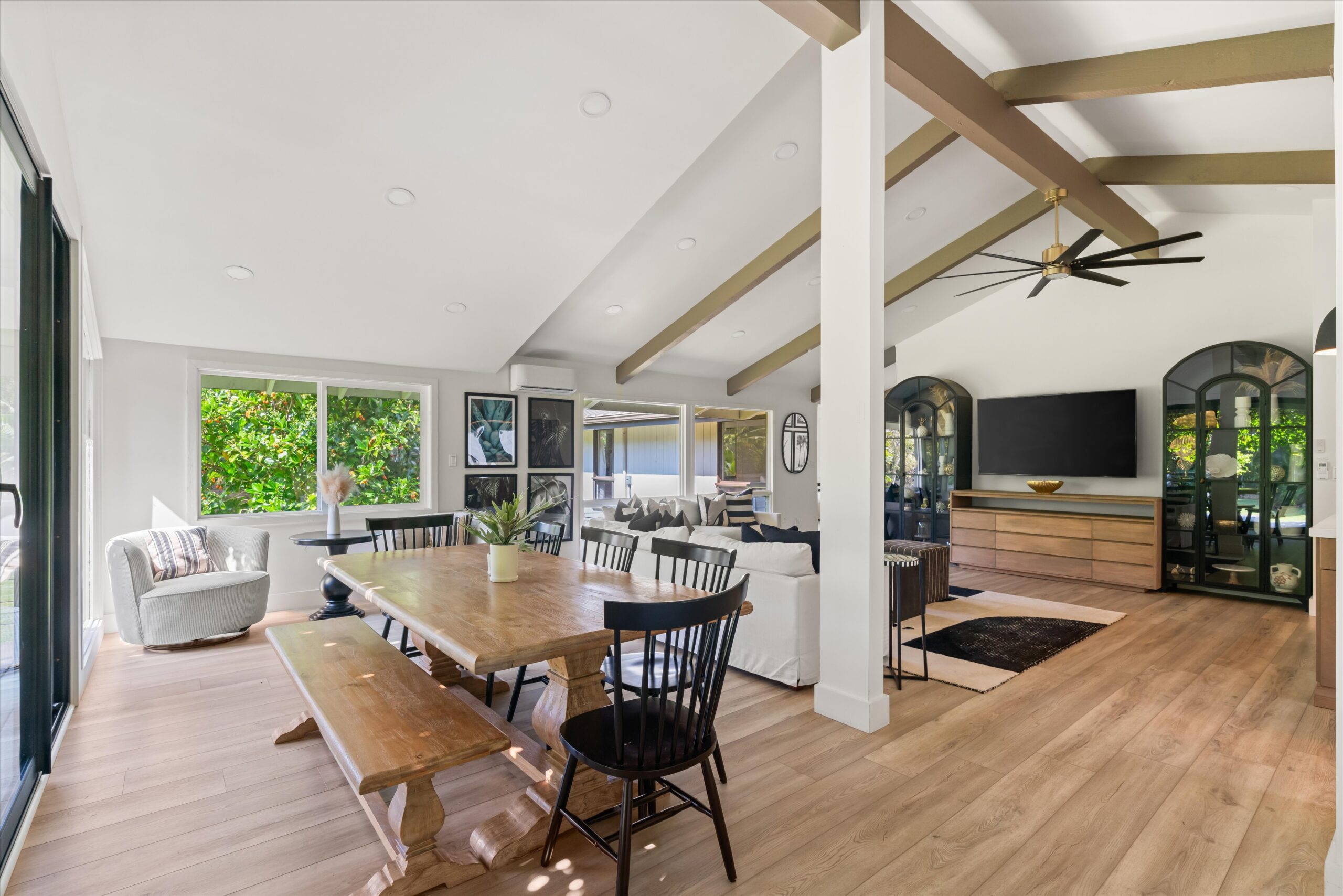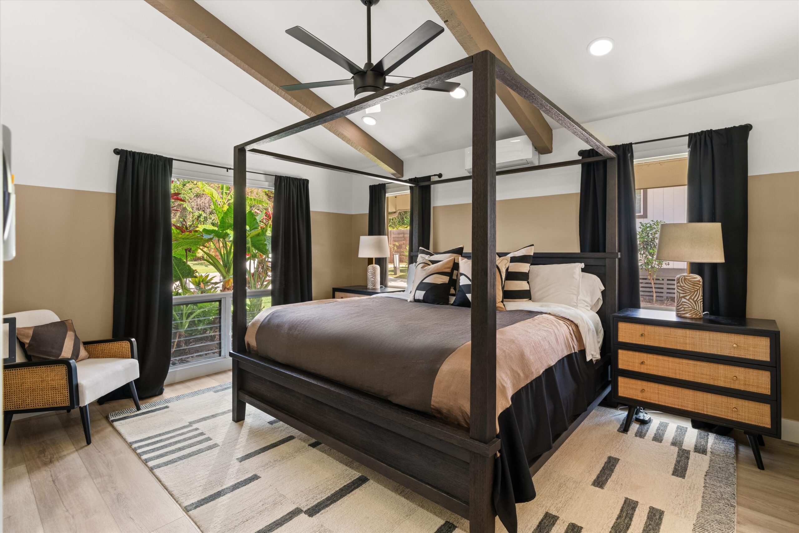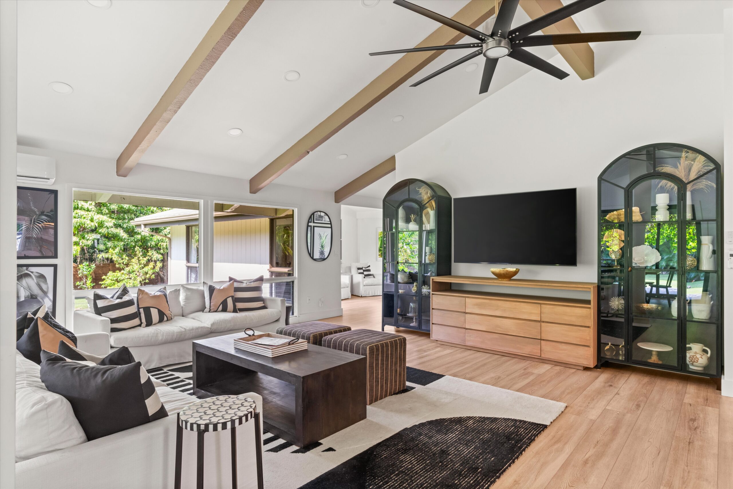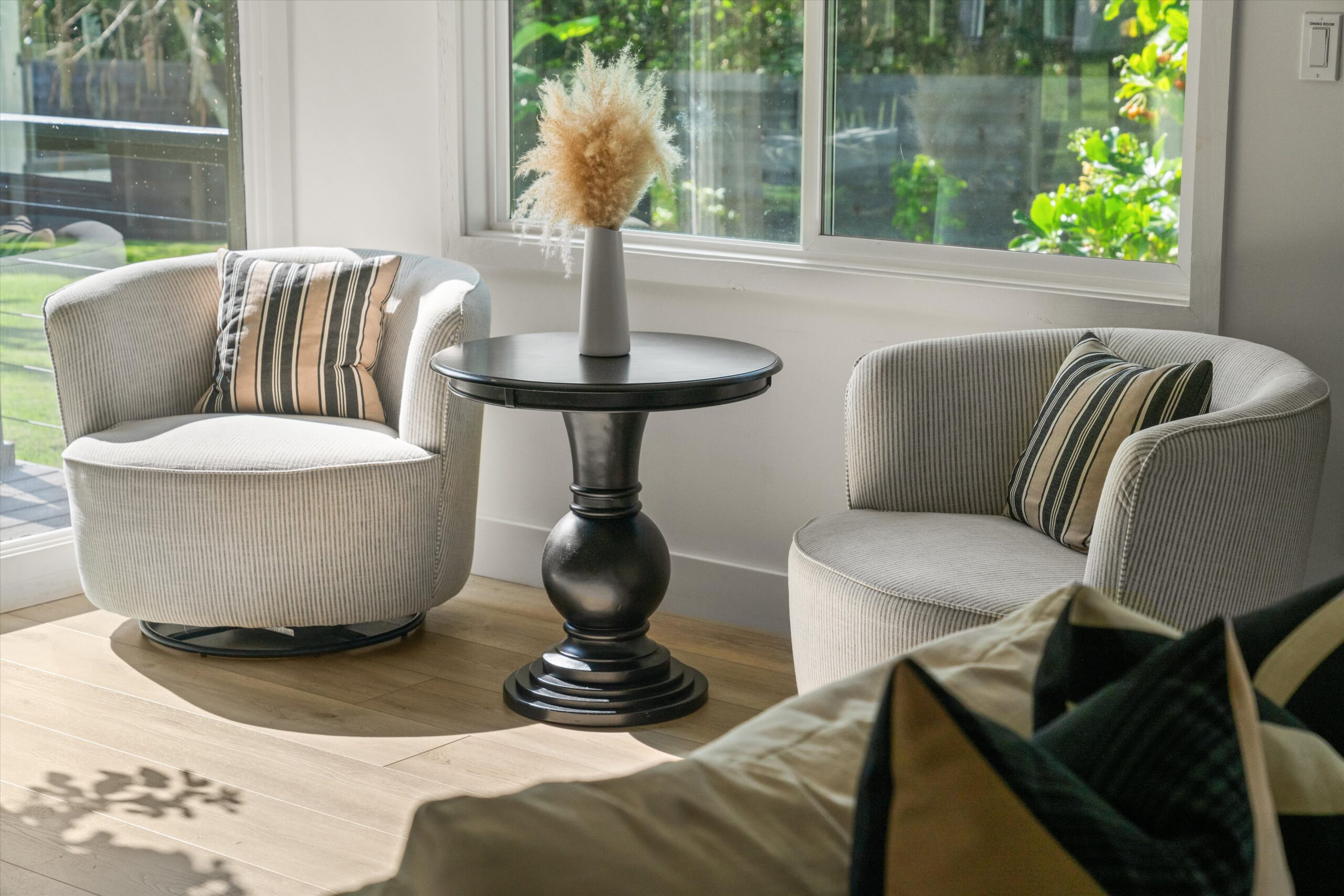 The detached guest house provides a peaceful escape with its own kitchen and private deck—perfect for quiet morning coffees or unwinding after a day at the beach. The lushly landscaped grounds feature a backyard oasis, where you can relax on the lanai, complete with charming bench swings and ample seating to enjoy Hawaii’s warm breezes.