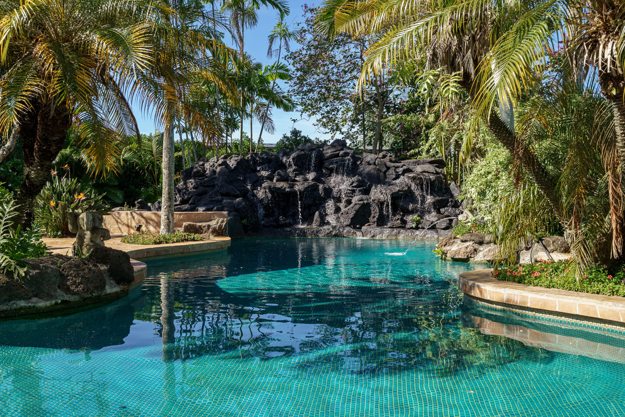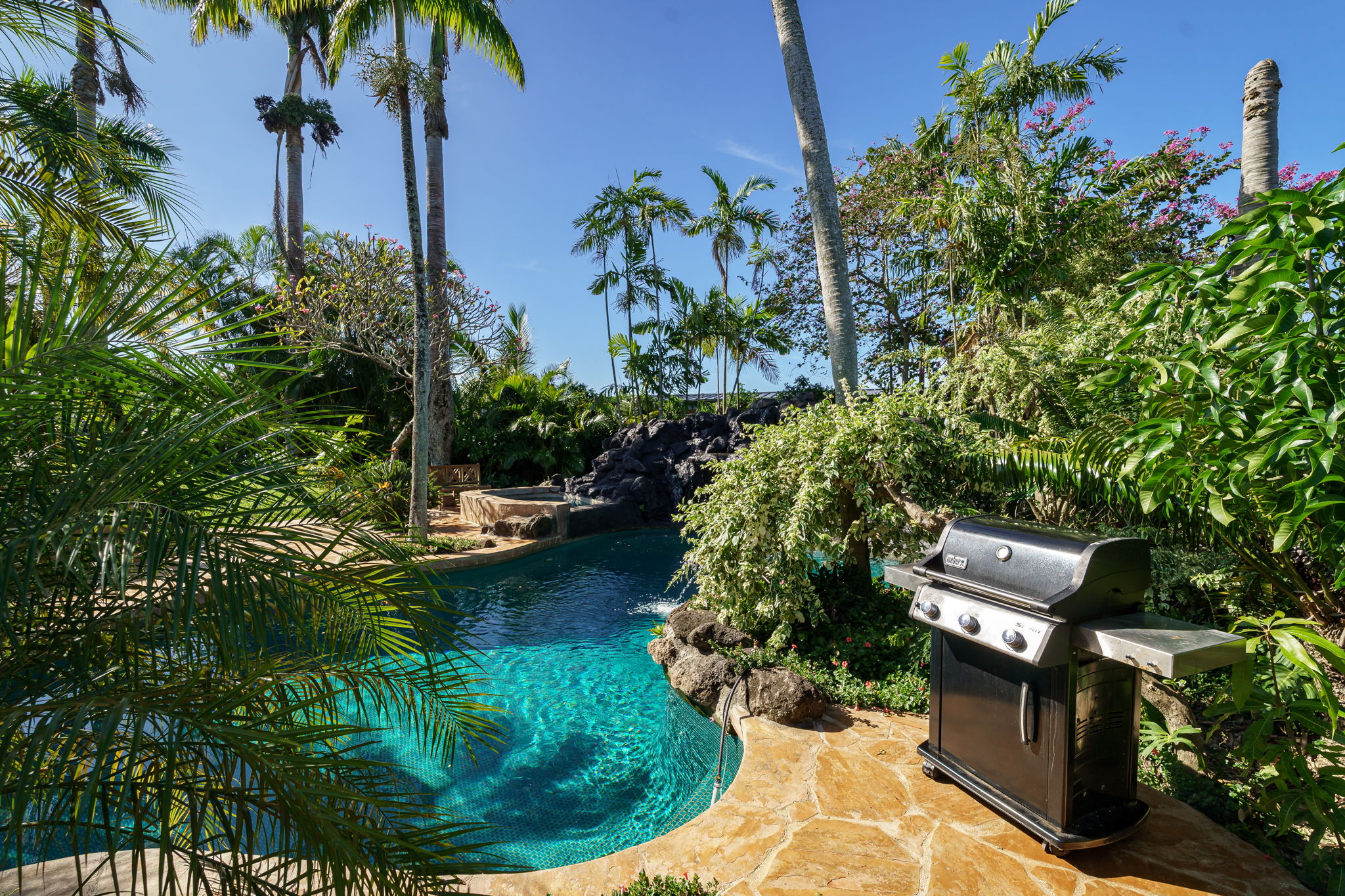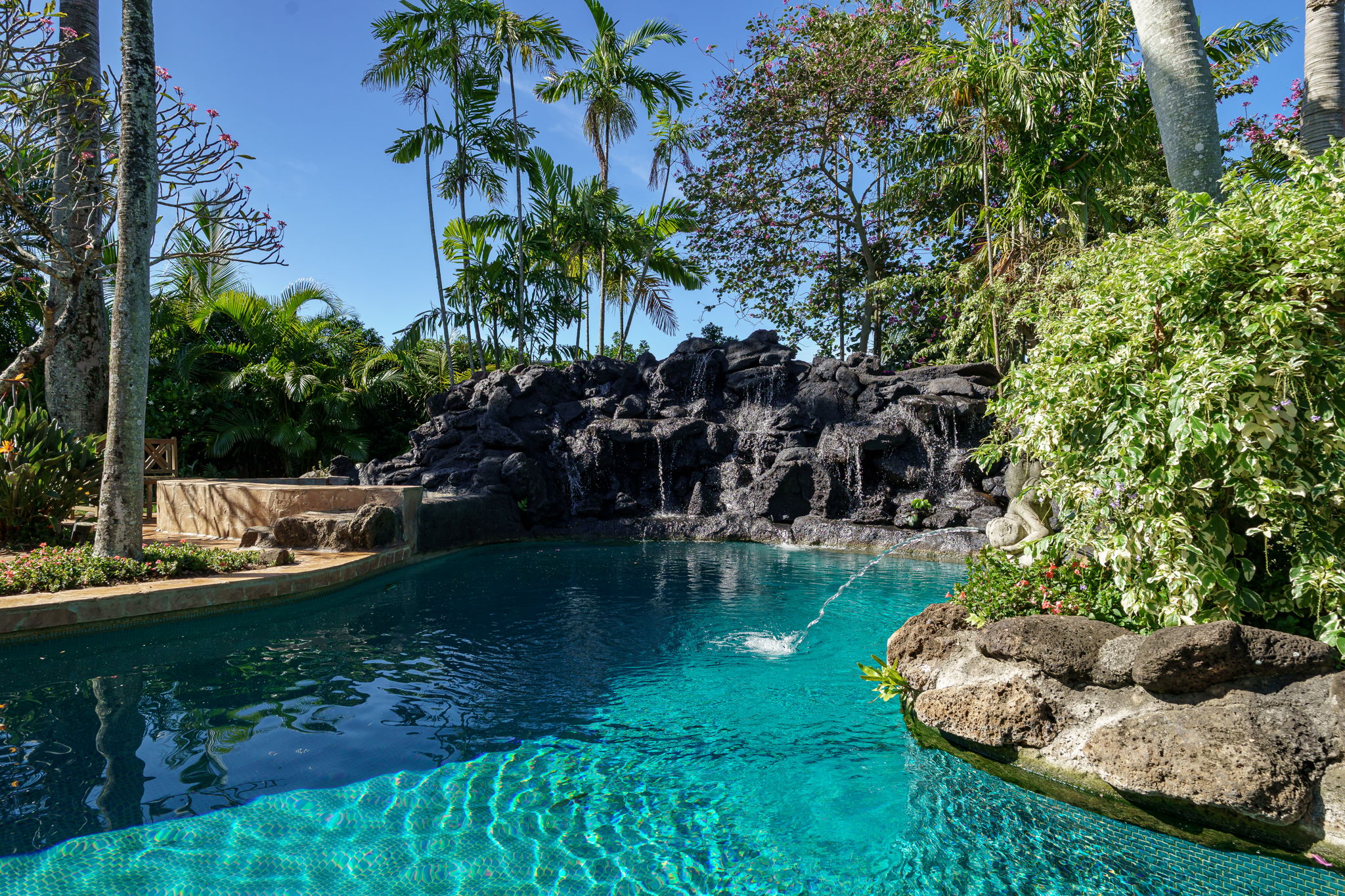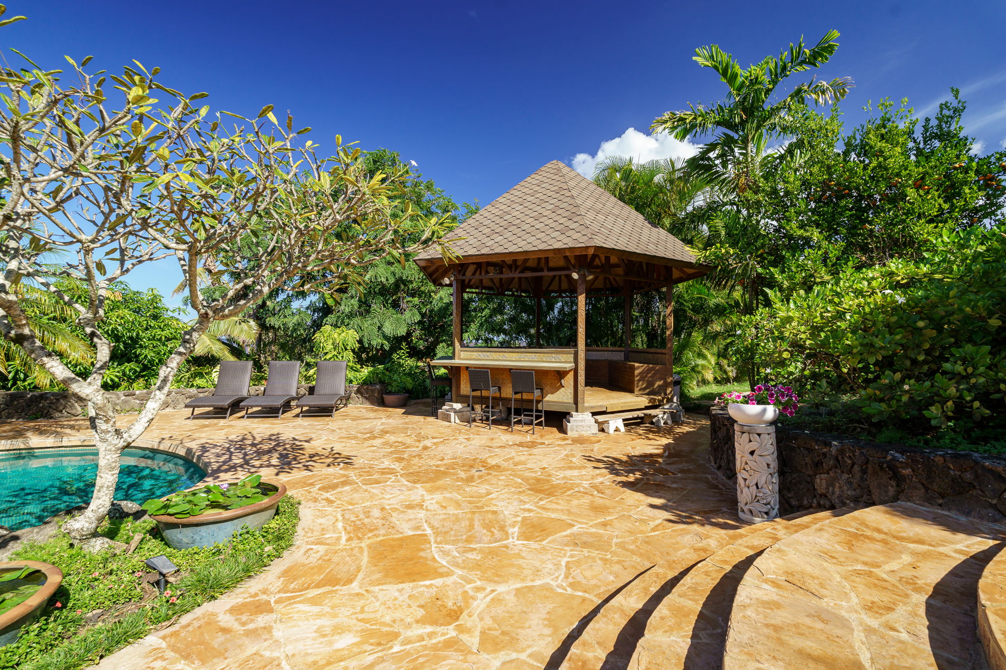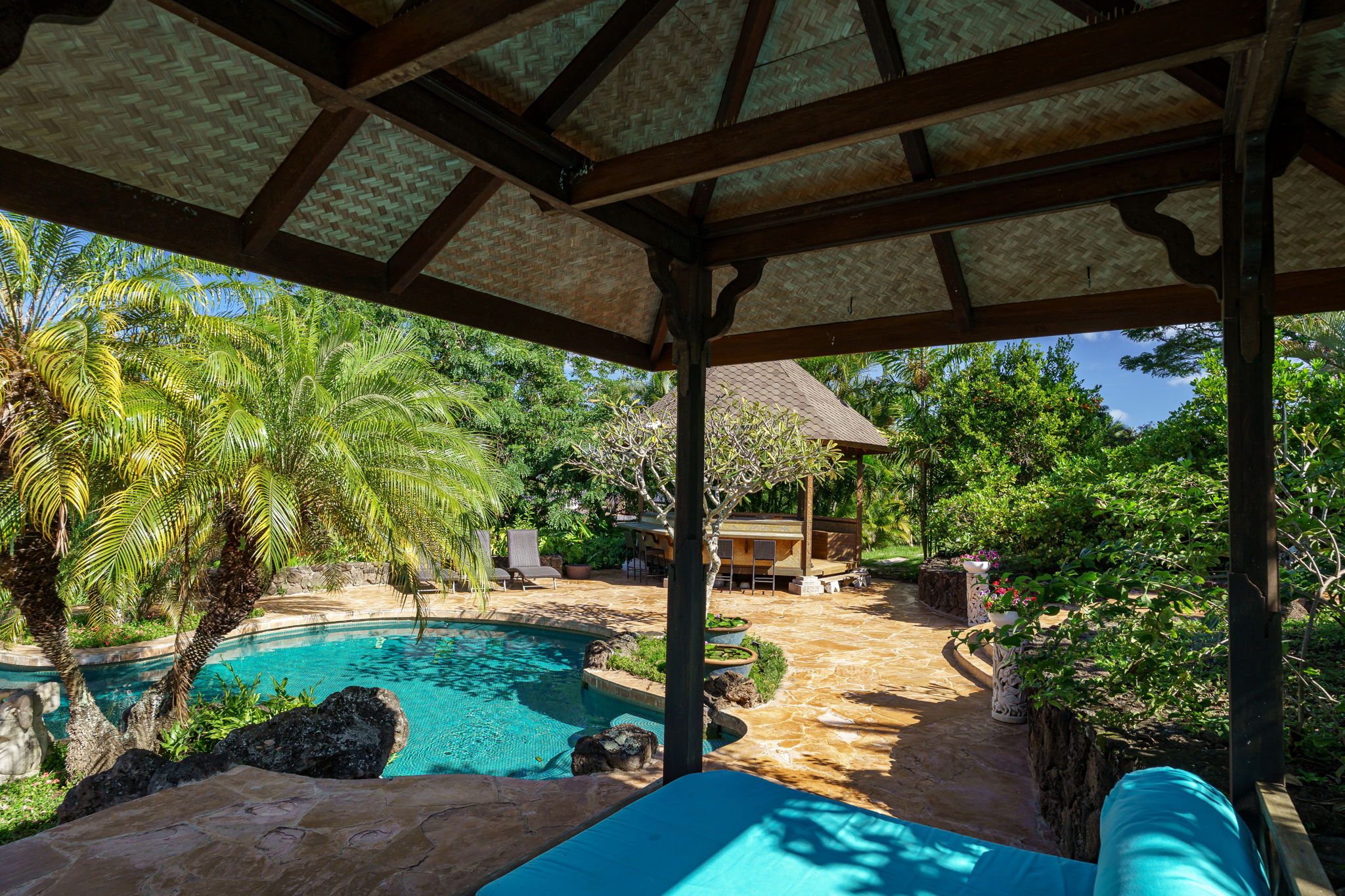 The expansive outdoor space delivers a resort-style atmosphere, featuring a sparkling pool with a cascading waterfall, poolside lounge chairs, and two covered gazebos: a daybed gazebo designed for relaxation, and a bar-style gazebo with dining table, ideal for gathering and entertaining.